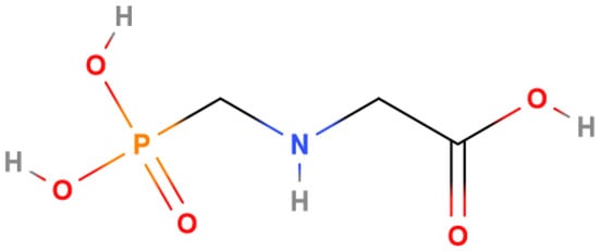 Glyphosate, with the IUPAC name N-(phosphonomethyl)glycine, also called 2-(phosphonomethylamino)acetic acid (Figure 1), is the most used herbicide in the world. It was introduced to the market in 1974 under the trade name of Roundup® for weed control in agriculture or for eliminating roadside weeds, as well as in orchards, forests, parks, and squares, and on railways. In traditional agriculture, glyphosate was used only in the pre-emergence phase, but after the introduction of genetically modified organisms (GMOs) resistant to Roundup®, it also began to be used in the post-emergence phase. In 1996, genetically modified soybean, corn, and cotton plants, called ‘Roundup® Ready’ plants, were introduced onto the market. Since then, the use of genetically modified organisms and the use of glyphosate have grown to unprecedented levels: about 660 million kg of global glyphosate use in 2011 and 826 million in 2014 are reported [1,2,3].
