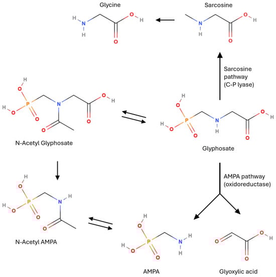 In general, glyphosate degradation proceeds by either of two pathways [53,54,55,56] as shown in Figure 2. They are also called ‘AMPA pathway’ and ‘sarcosine pathway’.