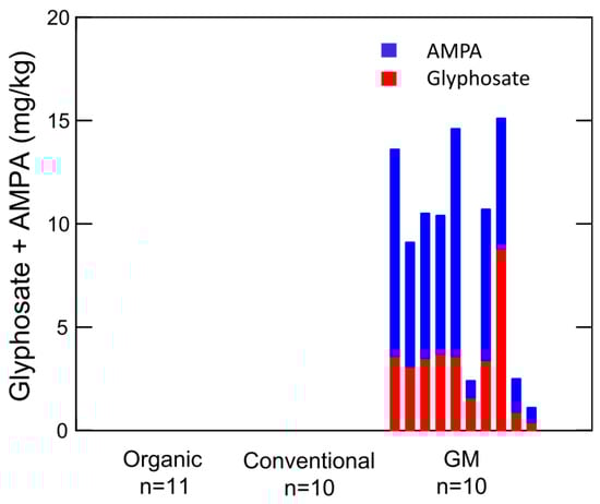 Residues of glyphosate and AMPA in individual soybean samples (n = 31). Excerpted from the work of Bøhn et al., 2014 [13].