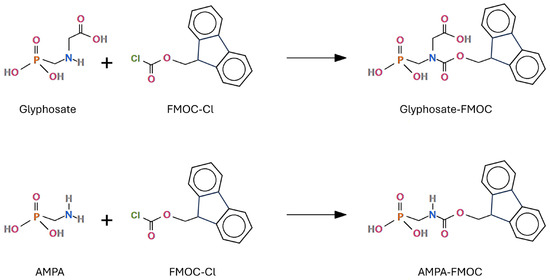 Analyses of glyphosate and AMPA in water have been performed for a long time by liquid chromatography with FMOC derivatization, and subsequently also codified by the ISO 16308:2014 standard [103,104]. The ISO 16308:2014 standard involves the use of a tandem mass spectrometer as a detector, but the method was originally based on HPLC–fluorimetry. By switching to mass spectrometry as a detection technique, better sensitivity was obtained. This method uses the derivatization of both molecules with 9-fluorenylmethyl chloroformate (FMOC-Cl), as shown in Figure 4.