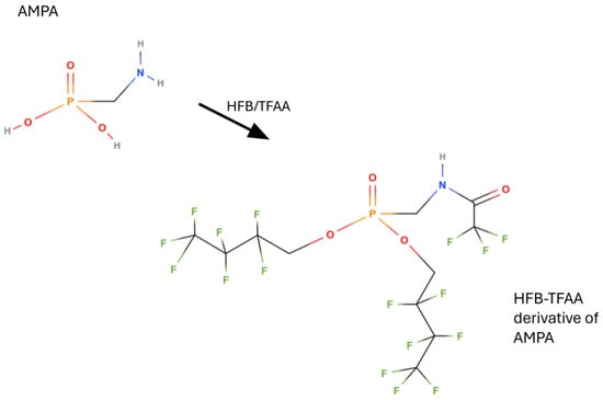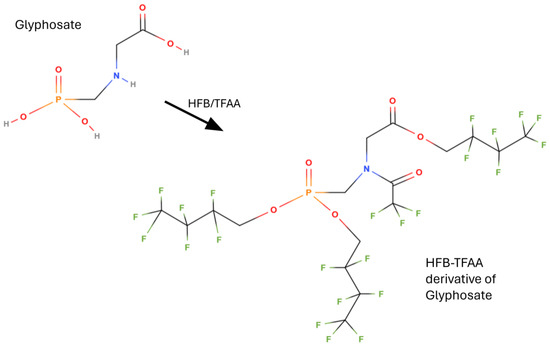 From the first works to the present day, the largely prevalent derivatization for determining glyphosate in gas chromatography is that using perfluoroalcohols and perfluorinated anhydrides, with trifluoroacetic anhydride (TFAA) used almost universally. In this way, all phosphonic and carboxylic acid groups are esterified, and all amino groups are acylated, as shown in Figure 5 and Figure 6. Such derivatization was first applied by Deyrup et al. in 1985 [118]. This is also the procedure codified in the AOAC Official method 2000.05 ‘Determination of glyphosate and AMPA in crops, gas chromatography with mass-selective detection’ [121,122,123]. A variant of the derivatization in Figure 5 and Figure 6 is the use of 2,2,2-trifluoroethanol (TFE) instead of HFB [46,48,49,50,51]. The crops tested in the interlaboratory study supporting the acceptance of the AOAC method were field corn grain, soya forage, and walnut nutmeat, but it is applicable to a wide variety of crops and processed commodities: over 100 matrices were successfully analyzed with virtually no method modifications required.