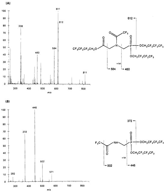 Electron impact mass spectra and structures of (A) glyphosate derivative (MW 811) and (B) AMPA derivative (MW 571). Reprinted with permission from Alferness and Iwata [123]. Copyright 1994 American Chemical Society.