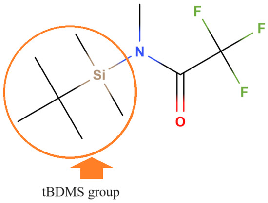 Alkylsilyl derivatization is a little-used procedure: it is mainly exploited in the gas chromatographic analysis of glyphosate and AMPA in biological fluids, such as serum and urine [125,126,127,128]. Furthermore, in some cases, the sensitivity is lower with respect derivatization with perfluoroalcohols and perfluorinated anhydrides. However, alkylsilyl derivatization is reported here for the sake of completeness. By far the most used reagent is N-methyl-N-(tert-butyldimethylsilyl)trifluoroacetamide (MTBSTFA), as shown in Figure 9. Such a reagent is capable of replacing three hydrogens of the glyphosate and AMPA molecules with three tBDMS groups.