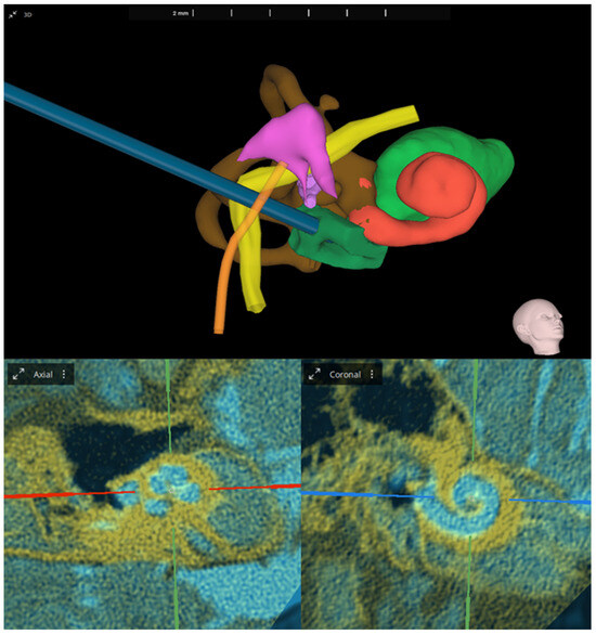 Among the innovative systems in otological planning is OTOPLAN, a software developed jointly by CASCINATION AG (Bern, Switzerland) and MED-EL (Innsbruck, Austria) [28]. The software, introduced in 2018, represents an advancement in the pre-surgical planning process for MED-EL CIs. This exclusive software constructs detailed 3D models of inner ear structures, including the cochlea, round window membrane, bony overhang, semicircular canals, and internal auditory canal, assisting surgeons in visualizing the precise placement of each electrode array (Figure 1). Users can also zoom in on the 3D reconstruction and rotate it in any direction, offering a complete 360° view. By leveraging a robust 3D modeling algorithm, OTOPLAN ensures accurate visualization, enabling surgeons to assess delicate cochlear structures before intervention and strategize optimal outcomes, tailored to individual anatomical conditions. OTOPLAN provides extensive capabilities for integrating various types of pre- and post-operative images (CT, MRI). These include fusing CT and MRI scans to visualize all relevant tissue types—bones, nerves, and soft tissue—or merging post-operative CT images with pre-operative cochlear measurements. This eliminates the need for audiologists to re-measure after implantation, streamlining the process and enhancing efficiency. Furthermore, image fusion is a tool for assessment of pathological findings, like vestibular schwannoma or intra-cochlear fibrosis, hence exceeding the software capabilities to be used strictly for cochlear implantation.