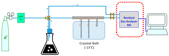 Before analysis, the VOC-rich gas stream was passed through a cryogenic trapping system at −13 °C to remove the condensable compounds with high molecular weight to prevent them from reaching the mass spectrometer. The background signals (IBG,i) were measured on the pure nitrogen stream before each test, bypassing the sample flask with a series of three-way valves. These signals were subtracted from the raw signals (Iraw,i) in order to obtain the effective values released from the sample.