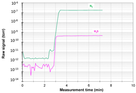 Preliminary tests were performed with a certified standard mixture of H2S (1000 ppm) in N2. This is a good reference value, considering the usual levels of H2S in asphalt [44]. Since 1 ppm of H2S in the liquid phase of asphalt corresponds to approximately 400 ppm in the vapour phase, asphalt with extremally high levels of H2S can reach 30,000 ppm of H2S in the vapour phase, and thus 1000 ppm of H2S is a representative concentration for a calibration standard. Tests with this standard mixture, fed directly into the gas analyser, allowed us to evaluate the response of the analysis system itself in well-defined conditions without other variables. Before this test, the background signals were measured while sampling an inert gas (argon), and the gas was then switched instantaneously to the calibration mixture. The raw signals of the test are shown in Figure 2, which demonstrates the rapid response of the analytical system to variations in concentrations. After the first ca. 3 min in which the background signals of the system are analysed, as soon as the standard mixture is sampled, both the N2 carrier signal and the H2S signal increase immediately, stabilizing in less than a minute. These two values are then used as a reference in data processing for the quantitative analysis of the unknown concentration in the H2S evolution experiments.