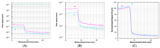 The bitumen was heated to 150 °C in the presence of paraffin oil prior to analysis of H2S. For the specific bituminous binder used in the present study, 10 g of paraffin oil was found to be the minimum quantity necessary for a sufficient reduction in the viscosity [41] to ensure continuous and stable magnetic stirring, which in turn is needed to guarantee a stable release of the volatile compounds from the sample into the headspace. Figure 3A,B report the raw signals as a function of time (with and without the N2 internal standard’s signal) of the H2S released from a bitumen sample analysed under the conditions described in Section 3.1.2. At the beginning of the sampling, the signals of H2S+ and HS+ are both stable in the range of 10−10–10−11 torr, demonstrating that both the flux of the carrier gas and the emission from the bitumen are stable. The N2 signal at m/z = 14 (N+ signal) is stable at 2 × 10−7 torr over the entire interval (Figure 3A). This is also an indication that the concentration of H2S in the headspace reached an equilibrium and is stable. Thus, all the subsequent variations in the signals are due to external factors. After 7 min, an aliquot of approximately 0.1 wt% of the HA.REMOVAL, relative to the amount of bitumen, was added with a syringe to the stirred hot bituminous sample. Almost immediately, there is a drastic drop of the specific signals of H2S: i.e., H2S+ and HS+. In fact, HA.REMOVAL is an additive commonly used as a scavenger of H2S from asphalt, and it is able to reduce the emission of hydrogen sulphide from bitumen even when added at low concentrations [45]. In addition to demonstrating its effectiveness as an H2S scavenger, this test demonstrates the fast response of the developed setup and method to follow the variation in the H2S concentration in the headspace of the hot bitumen flask: within about two minutes, half the time to refresh the headspace volume, the characteristic signals drop to less than 20% of their starting value. The two monitored signals have an identical profile, and both can be used for analytical purposes. In particular, the most abundant signal H2S+ (m/z = 34) can best be used for the quantification of the H2S emission, while the less abundant HS+ (m/z = 33) is useful for the unambiguous identification of the species, excluding possible overlap with other signals. This improves the specificity of the method for this application, avoiding interference with other compounds that may be present and can cause problems with the analysis, especially in the case of complex matrices such as asphalt. On the other hand, the S+ signal at m/z = 32 is unsuitable due to overlap with the O2+ signal, which may be present as a background signal or as a result of other oxygen-containing species and humidity in the sample. It must be noted that we follow the H2S+ and HS+ signals as markers for the H2S concentration in the headspace, but especially for HS+, we cannot exclude that this is also formed by fragmentation of volatile mercaptans that might be present in the headspace. However, the contribution of mercaptans is expected to be very low, first of all because most of them are condensed in the cold trap and secondly because the HS+ is one of the weakest signals of mercaptans. In any case, the H2S+/HS+ signal ratio of the H2S standard can be taken as a reference to check the presence of other sources of H2S+ and/or HS+ signals.