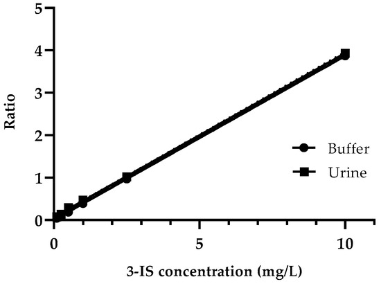 The calibration curves produced using diluted urine from a patient with a low 3-IS concentration and artificial urine were superimposable and similar (Figure 1; Slope test, p = 0.98).
