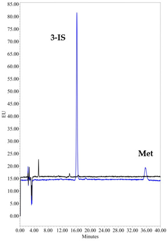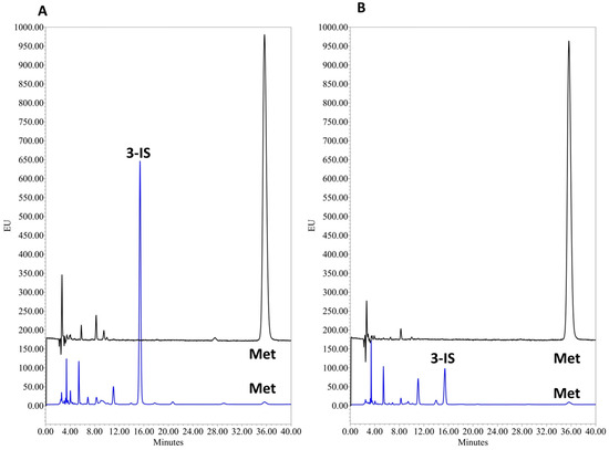 Overlay of chromatograms of urine samples spiked with internal standard from pediatric patients at 375 and 300 nm emission wavelengths. Chromatograms of patient 1 (A) and patient 2 (B). Blue lines: chromatograms of urine samples spiked with metoprolol 10 mg/L from two representative patients at 375 nm emission wavelength. Black line: Chromatograms of urine samples from two representative patients at 300 nm emission wavelength. Abbreviations: 3-IS3-indoxyl sulfate; Met: metoprolol.