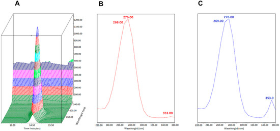 Absorption spectra at the retention time of 3-IS of (A) 3-IS U-LOQ (3D spectra), (B) 3-IS U-LOQ (2D spectra), and (C) 2D absorption spectra of a urine sample from a healthy volunteer.