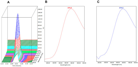 Emission spectra at the retention time of 3-IS of (A) 3-IS U-LOQ (3D spectra), (B) 3-IS U-LOQ (2D spectra), and (C) 2D emission spectra of a urine sample from a healthy volunteer.