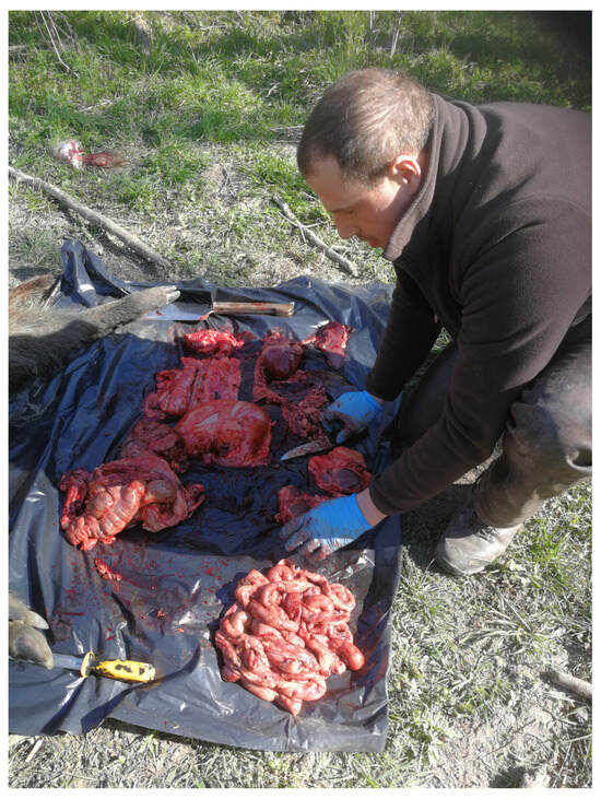 After shooting, the game should be retrieved immediately, and internal organs should be removed promptly. Ideally, dissection occurs on the same day, with special attention to parasites in the muscles. The carcass is thoroughly examined, starting with an incision from the ventral side. For males, the penis and testicles are removed, followed by opening the abdominal wall from the sternum to the groin []. With the animal on its back, incisions are made towards the pelvis with the blade edge facing outward. The anus is tied off with 15–20 cm of twine to prevent contamination and sample loss, then pulled into the abdominal cavity.