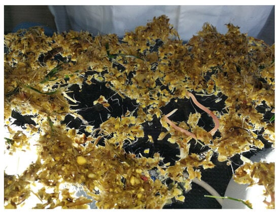 The intestinal contents collected in the strainer are thoroughly washed with a substantial volume of running water until only larger fibrous materials, endoparasites, and annelids consumed during feeding remain. Larger nematodes, such as roundworms, whipworms, and white-tailed worms, can be readily identified and distinguished by the naked eye when the intestinal sludge is passed through a strainer with a mesh diameter of 0.2–0.3 mm []. After allowing the contents to drain briefly, transfer them onto the examination table. Often, visible signs of infection can be observed during the washing process.