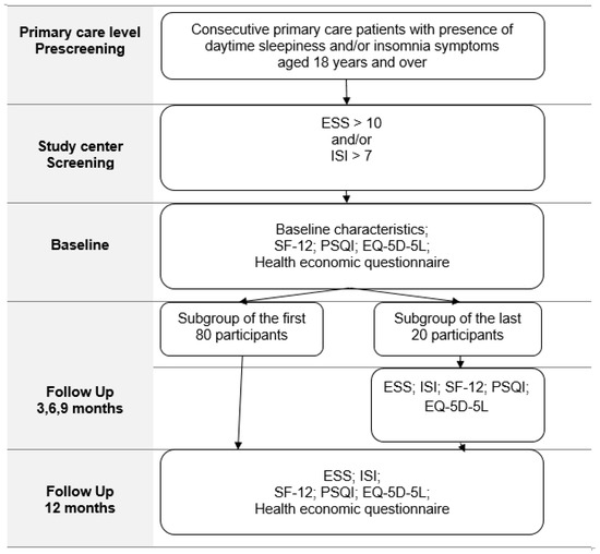 Figure 1 shows the study flow chart. Primary care level patients with subjective daytime sleepiness and insomnia symptoms assessed with ESS and ISI complete an online survey including standardized quality of life and sleep quality questionnaires, as well as specially designed health economic questionnaires with follow-up until 12 months.