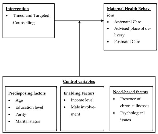 The conceptual framework for this study is based on an adapted Andersen’s Behavioural Model (shown in Figure 1). It shows how maternal health behaviours are influenced by ttC in the presence of various factors proposed by Andersen’s model [,]. According to Andersen’s model, predisposing, enabling, and need-based factors affect maternal healthcare utilization []. In the current study, predisposing factors include social and demographic factors such as the mother’s age, education level, parity, and marital status. The enabling factors include income level of the household and male involvement in the pregnancy journey. The need-based factors are the presence of chronic illnesses, and psychological issues of the mother. While of importance to the study is the impact of ttC on maternal health behaviours, Andersen’s model helps us to account for how predisposing factors, enabling factors, and need-based factors shape healthcare utilisation. Secondarily, it contributes to understanding the contextual factors influencing maternal health outcomes, which supports efforts to address healthcare access inequality and inform policy development for more equitable access to care [,].