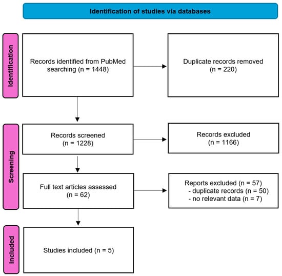 The study selection process is summarized in Figure 1. A total of 1448 records were identified via Medline. After the removal of duplicates, 1228 records were examined for eligibility. Then, 1166 were excluded and 62 full texts were recovered. Fifty studies were excluded as they were duplicated and seven because they did not present data relevant to our analysis. Therefore, 5 RCTs [27,28,29,30,31] were included in the systematic review.