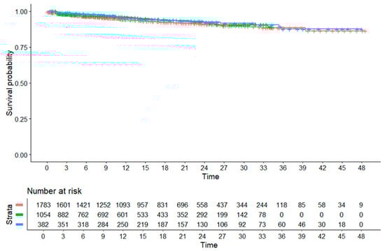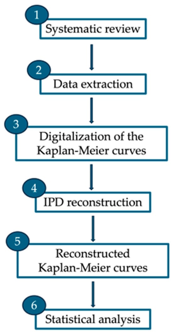 The IPDfromKM method was used to reconstruct IPD from survival curves [5,7]. The curves were digitized with Webplotdigitizer (version 4.5; accessed on 10 January 2024) and then inserted into the IPD reconstruction tool of the IPDfromKM software (version 1.2.3.0; subprogram “Reconstruct Individual Patient Data”). The reconstructed IPD included the time of observation (i.e., difference between enrollment and last follow-up) and the patient’s outcome at the last follow-up (alive, dead, or censored).