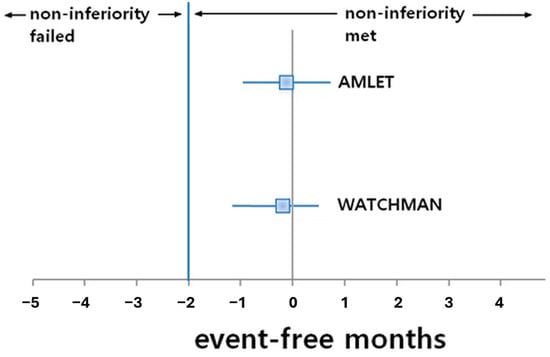 The results of the non-inferiority analysis are summarized in Figure 3. The Forest plot shows that CIs have remained far from the non-inferiority margin (set at a 2-month loss in event-free survival, as indicated above). Hence, non-inferiority has been clearly demonstrated for both devices (pnon-inferiority < 0.01 for Amlet and <0.05 for Watchman).