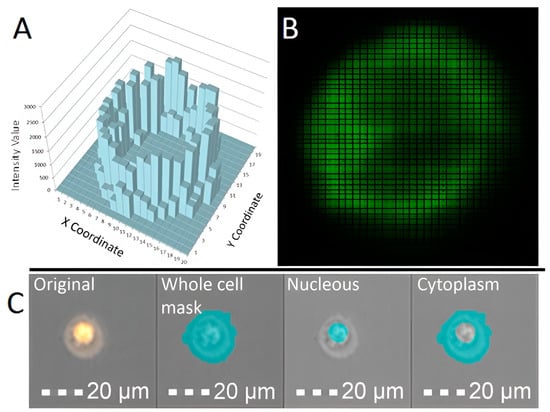 This figure shows how Cytek® Amnis® imaging flow cytometers create images and masks. (A): The CCD camera collects signals from individual pixels. The Z-axis represents the brightness of the fluorescent signal, while the X and Y axes show the cell’s position on a flat surface. Each small square (pixel) on the X and Y grid captures part of the fluorescent signal. (B): A 2D image is formed based on the signals from the CCD camera. The brightness of each part of the image depends on how many photons (light particles) come from different areas of the cell. (C): This is an example of creating a new mask by combining basic masks using the logical NOT operator.