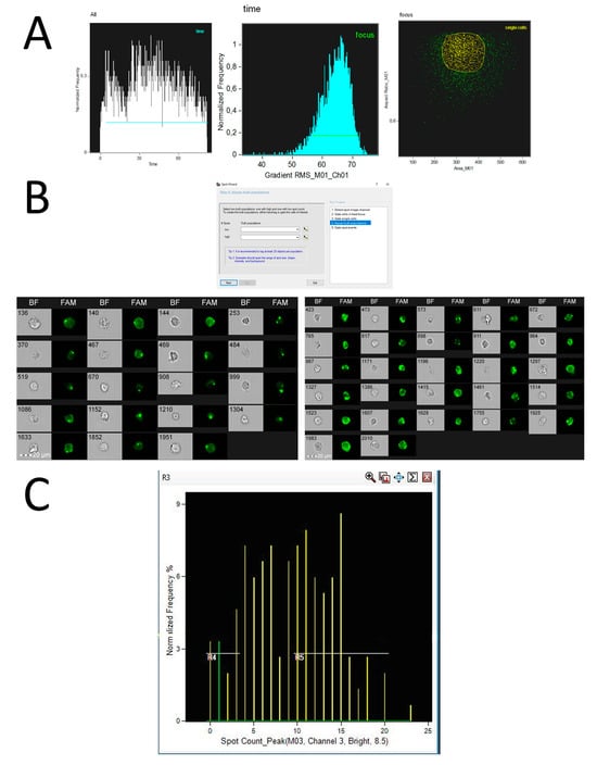 The detection of hybridization spots in MT-4 culture fixed cells using imaging flow cytometry (Cytek® Amnis® Flow Sight) with the Spot Localization wizard. The Spot Localization wizard is an algorithm in the Amnis IDEAS 6.2 software designed to count fluorescence points generated during in situ fluorescence hybridization. In this study, custom probes labeled with FAM (a fluorescent dye) were used to target and bind to specific HIV genes. Fluorescence was excited using a 488 nm laser with a power of 60 mW, and detection was performed in the green channel using a 532/55 nm light filter. The images were captured at a 20× magnification (lens NA = 0.6), with a pixel size of 1 × 1 µm. (A)—The gating strategy for isolating single-cells. The analysis begins by gating cells that appear in the camera’s field of view 10–20 s after recording starts. This step helps eliminate potential contamination from the previous sample. Next, cells in focus are selected, followed by the isolation of single-cells for further analysis. (B)—Using the “Spot Wizard” tool in IDEAS 6.2 software. The “Spot Wizard” tool was used to separate cells based on the number of hybridization spots. The cells were divided into two populations: those with a low number of hybridization spots (1–3 spots) and those with a high number of hybridization spots (>4 spots). The left plot shows cells with a low number of spots, while the right plot shows cells with a high number of spots. (C)—The distribution of hybridization signals. The plot generated by IDEAS 6.2 software shows the distribution of cells based on the number of hybridization signals. The X-axis represents the number of hybridization points detected, while the Y-axis shows the normalized number of cells.
