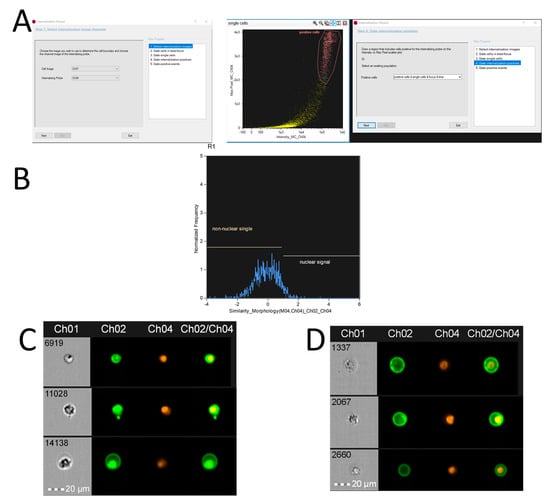 The algorithm for using the Nuclear Localization wizard in IDEAS 6.2 software. The Nuclear Localization wizard is a tool in the IDEAS software designed to determine whether a fluorescent label is located inside the cell (cytoplasm) or outside the cell (nucleus). This tool uses the Similarity Feature to compare the correlation between the fluorescent signals in different parts of the cell. For accurate results, two labels are required: one for the cytoplasm and one for the test signal. If the signals show a positive correlation, the test signal is located in the cytoplasm. If the correlation is negative, the signal is localized in the nucleus. The images used in this analysis were obtained from MT4 fixed cells using imaging flow cytometry (Cytek® Amnis® Flow Sight). The cells were stained with Annexin V-FITC and propidium iodide (PI) to assess cell viability. Fluorescence was excited using a 488 nm laser with a power of 60 mW. The green fluorescence from FITC was detected in the second channel using a 532/55 nm filter, while the red fluorescence from PI was detected in the third channel using a 577/35 nm filter. The images were captured at a total magnification of 20× (lens numerical aperture = 0.6), with a pixel size of 1 × 1 µm. (A)—The selection of the channel for whole-cell images and the probe channel, identifying cells with positive fluorescent signals. (B)—The output of the Nuclear Localization wizard algorithm, showing two distinct cell populations: one with nuclear signal localization (right gated population) and one with extranuclear localization (left gated population). (C)—A sample of cell images with nuclear signal localization, identified by the Nuclear Localization wizard algorithm. (D)—A sample of cell images with extranuclear signal localization, identified by the Nuclear Localization wizard algorithm.