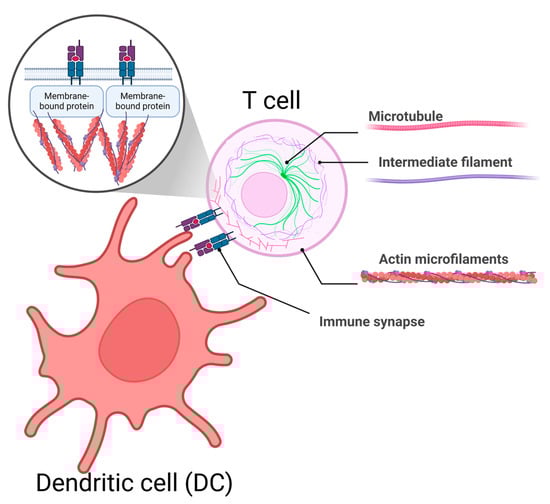 The cytoskeleton is a dynamic structure inside cells made up of three main parts: microtubules, intermediate filaments, and actin microfilaments [52]. Actin microfilaments are the smallest of these, with a diameter of 6–8 nm. They help maintain the cell’s shape and can attach to the inner side of the cell membrane, allowing parts of the membrane to move relative to each other. Microtubules, the largest cytoskeletal structures at 25 nm in diameter, are made of two key proteins: alpha and beta tubulin. These structures play a crucial role in moving materials within the cell, using energy from ATP. Transport occurs in both directions, towards the “plus” and “minus” ends of the microtubules. Importantly, this system is also used to transport proteins from the HIV capsid [57].