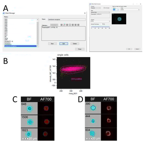 Visualization of CD4 receptor localization on the cytoplasmic membrane using IDEAS 6.2 software. The CD4 receptors were labeled with Alexa Fluor 700 (AF700) antibodies (BD Biosciences, Becton, Dickinson and Company, Franklin Lakes, New Jersey, USA). The images were captured from MT4 cell cultures using imaging flow cytometry (Cytek® Amnis® FlowSight). A 642 nm laser with 100 mW power was used to excite the fluorescence, which was detected in the red channel using a 702/85 nm filter for AF700. The images were taken at 20× magnification (lens NA = 0.6), with a pixel size of 1 × 1 µm. (A)—The creation of a simple mask to isolate the membrane stained with AF700-labeled antibodies against CD4. The Threshold parameter was set to exclude pixels with brightness below 37. (B)—A graph showing the relationship between cell area and fluorescence intensity of AF700-labeled CD4 receptors. (C)—The bright-field and fluorescent images of the cells with uniform CD4 receptor distribution on the membrane. The left image shows the bright-field view with a LevelSet mask, while the right image displays the fluorescent signal with a custom membrane receptor mask applied. (D)—The images of the cells with uneven CD4 receptor distribution on the cytoplasmic membrane.