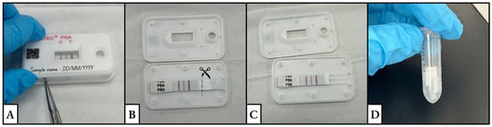 Figure 1. The series of images depicts the process of (A) opening a test cassette using tweezers, (B,C) cutting the sample pad, and (D) placing the cuttings in a clean and labeled tube. - Using a clean scalpel or clean pair of scissors, cut off the sample pad from the rest of the test strip. Cut into multiple pieces (~5 mm). This size allows for the extraction buffer to completely cover the sample pad (Figure 1B,C).