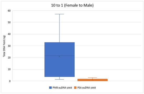 Total autosomal DNA (auDNA) Yield (ng) from 10 to 1 Sample Pads. The total auDNA yield from the PMB tests ranged from 1.36 ng to 56.89 ng, whereas the yield from the PSA tests ranged from 0.042 ng to 2.84 ng.