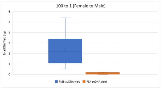 Figure 2 and Figure 3 compare the total DNA yield (ng) for 10 to 1 and 100 to 1 Female to Male samples from both PMB and PSA tests, with all samples quantified in duplicate. The results show a wide range of total DNA yield across these proportions from the PMB tests. The 50 to 1 PMB samples had significantly lower DNA yields (0.019 ng–0.124 ng) for autosomal DNA and 0.014 ng–0.121 ng for Y chromosome DNA compared to the 10 to 1 and 100 to 1 proportions. In the 1 to 1 samples the PMB test yielded much higher DNA yields (242.88 ng for autosomal DNA and 253.24 ng for Y chromosome DNA) than the PSA Semiquant test (15.11 ng and 16.51 ng, respectively).