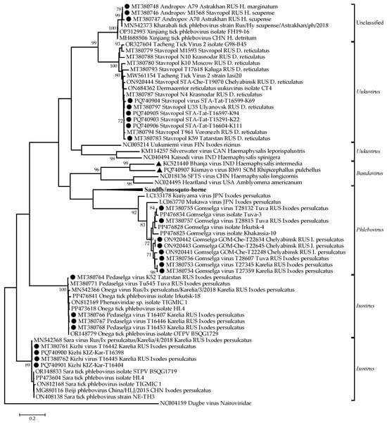 Phylogenetic analysis of the family Phenuiviridae. Phylogenetic trees were constructed using fragments of the L segment (nt positions 2297 to 2806) in MEGA X with the maximum likelihood method (1000 bootstrap replications). Black circles—isolates of the phenuiviruses described in this study. Black triangles—strains of the phenuiviruses used in this study as a control.