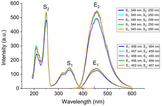 Excitation and emission spectra of the 1 ppm quinine standard solution. The spectra collected, one excitation and two emissions, are color-coded to designate the different data sets. Spectra were obtained with monochromator slit widths of 5.0 nm and a PMT voltage of 600 V. The λmax values for the first excited singlet state (S1), second excited singlet state (S2), first emission (E1), and second emission (E2) are listed. Five replicates were recorded for excitation and emission spectra (n = 5). Spectra were collected at room temperature.