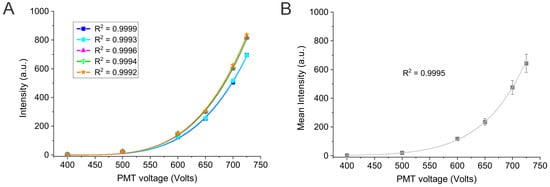 (A) Plot of fluorescence intensity vs. PMT voltage for five different data sets. Data points were best fit with the power function (second order), and the corresponding correlation coefficient R2 values are provided. (B) Plot of the mean fluorescence intensity and PMT voltage. The mean intensity was calculated by averaging out the five intensity values at each voltage, and the corresponding standard deviation is represented by the error bars (n = 5). The correlation coefficient for the best-fit line is shown on the plot.