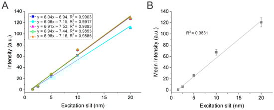 (A) Plot of fluorescence intensity vs. excitation monochromator slit width for the five groups. The linear best-fit lines, linear regression equations, and correlation coefficients are displayed for each group. (B) Plot of the mean fluorescence intensity as a function of excitation slit width. Error bars represent standard deviations from five datasets (n = 5). Data were collected at a PMT voltage of 600 V with an emission monochromator slit width of 5 nm.