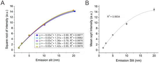 (A) Plot of the square root of fluorescence intensity vs. emission monochromator slit width for the five groups. The polynomial best-fit lines, quadratic equations, and correlation coefficients are displayed for each group. (B) Plot of the mean square root of intensity as a function of emission slit width. Error bars denote standard deviations from five datasets (n = 5). Data were collected at a PMT voltage of 600 V with an excitation monochromator slit width of 5 nm.