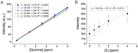 Calibration curves prepared from the quinine standard solutions using the external (A) and the internal (B) standard addition methods. The linear best-fit lines, linear regression equations, and correlation coefficients are displayed for each group in panel A (n = 5). Data were collected at excitation and emission wavelengths of 350 nm and 450 nm, respectively, with a PMT voltage of 600 V and slit widths set to 5 nm each. The Canada Dry tonic water sample was used for the internal standard (Si) method in panel B, and the fluorescence intensity is an average of two replicates (n =2). Standard deviations are represented by the error bars.
