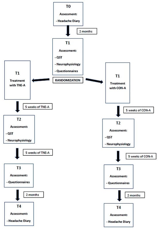 After screening for inclusion/exclusion criteria (T0), patients will complete a headache diary for one month before entering the study (T1). At this point, they will undergo QST, neurophysiological assessments, and questionnaire evaluations before being randomly assigned to either the experimental (TNE-A) or control (CON-A) group (further details provided in the next section).