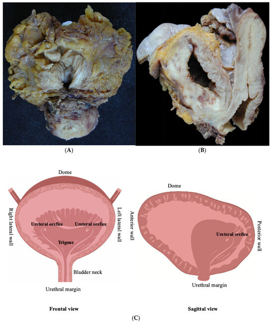 Standard surgical specimens: (A) radical cystoprostatectomy in a man and (B) radical cystectomy and hysterectomy in a woman, (C) schematic drawing of the anatomical regions of urinary bladder.