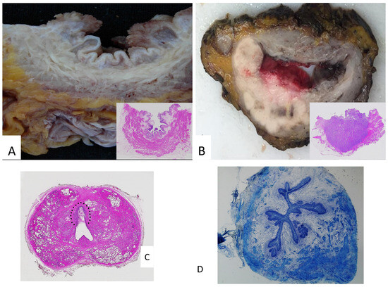 Figure 2. (A) Papillary lesions of the bladder: macroscopy and microscopy (inset). (B) A whole-mount bladder section featuring a solid neoplasm, which invades the perivesical adipose tissue: macroscopy and microscopy (inset). (C) A whole-mount prostate section featuring a urothelial carcinoma in the prostatic urethra (within the dotted line). (D) Frozen section of ureteral margin (Toluidine blu stain).