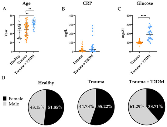 Cohort characteristics. (A) Age distribution of all participants, (B) CRP levels, and (C) blood glucose levels of the patients. (D) Gender distribution of the cohort. Healthy N = 27, Trauma N = 67, Trauma + T2DM N = 31. Statistical analysis was conducted using the Kruskal–Wallis test (A), and the Mann–Whitney test (B,C). ** p < 0.01; **** p < 0.0001.