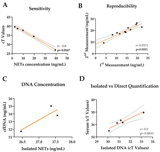 Collected serum and plasma samples were used to quantify the released NET amount as measured by DNA using qPCR without prior isolation (Figure 2). The plasma samples did not give readings from the qPCR experiments; therefore, only the serum samples were used in our further qPCR-based experiments. A standard curve for absolute quantification was composed using known concentrations of isolated NETs, and the detection limit was 2.4–39.2 ng/mL (Figure 3A). To check the sensitivity and stability of the method, the same qPCR experiment was repeated after 2 months with the same samples. During this period, the samples were stored at −80 °C. To rule out the possibility of handling differences, the repetition experiment was conducted by a different researcher. The relationship between the two results showed a robust correlation (Figure 3B), indicating that the storage of the samples or handling by different individuals does not affect the outcome (r = 0.9371). The qPCR method was performed using isolated NETs and serum samples without isolation from the same donors to assess the yield with and without an isolation step. The results show a trend of correlation (Figure 3C). Furthermore, the correlation between the isolated circulating cfDNA samples from the serums and the direct use of serum samples was investigated. The results revealed a strong positive correlation between the isolated cfDNA and the directly used serum samples.