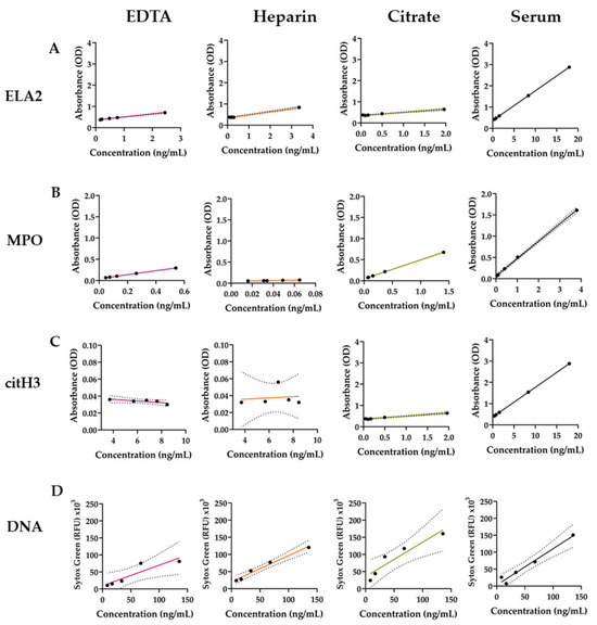 After determining the sensitivity of the qPCR method, other frequently used methods were evaluated. ELISA is a commonly used approach for the quantification of NETosis. The blood samples collected using different types of blood collection tubes were compared with the ELISA analysis. Plasma samples were collected using EDTA, heparin, and citrate blood tubes. Serum samples were collected using serum blood tubes. The proteins associated with NETosis, such as ELA, MPO, and citH3, were chosen for the assessment using ELISA. According to the results, serum samples have the highest sensitivity in ELA2, MPO, and citH3 detections (Figure 4A–C, Table 4). The other three sample-type curves show a difference between all three proteins; however, they have a lower sensitivity for all the kits. The limit of detection (LoD) and the limit of quantification (LoQ) were the lowest with serum samples, except for the MPO kit. The citH3 ELISA kit lost its sensitivity when the sample had a lower concentration.