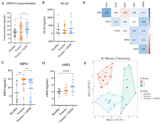 Assessment of the cfDNA concentration and the NETosis-related proteins in the study cohort. (A) The concentration of cfDNA in serum samples was determined using qPCR for the KRAS gene. Healthy N = 27, n = 3; Trauma N = 67, n = 3; Trauma + T2DM N = 31, n = 3. (B–D) Protein concentrations were measured from serum samples with respective ELISA kits. ELA2: Healthy N = 10, n = 2; Trauma N = 40, n = 2; Trauma + T2DM N = 30, n = 2. MPO: Healthy N = 10, n = 2; Trauma N = 40, n = 2; Trauma + T2DM N = 30, n = 2. citH3: Healthy N = 10, n = 2; Trauma N = 15, n = 2; Trauma + T2DM N = 15, n = 2. Data points demonstrate the mean of the technical replicates. Statistical analysis was performed using the Kruskal–Wallis test. * p < 0.05; ** p < 0.01 as indicated. (E) Spearman’s correlation matrix of variables. Correlation coefficients were calculated using the Spearman method in R for complete observations. Blue represents a positive correlation, whereas red represents a negative correlation. (F) K-means results via PCA components. In the resulting plot, patient observations are represented by shapes, and using principal components, concentration ellipses around each cluster are drawn. The circles in the middle represent centroids. Diamonds represent healthy controls N = 7, triangles represent trauma patients N = 15, and squares represent trauma patients with T2DM N = 14.