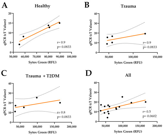Correlation between the cfDNA quantification using qPCR and fluorometry. The same samples were assessed using the qPCR method and the Sytox Green staining. (A) cfDNA from healthy volunteers. N = 5, n = 2; (B) cfDNA from trauma patients. N = 5, n = 2; (C) cfDNA from trauma patients with T2DM. N = 5, n = 2. (D) Correlation of all groups combined. N = 15, n =2. Correlation was performed using Spearman (r). Data points represent the means of the technical replicates. The dotted lines indicate 95% confidence intervals.
