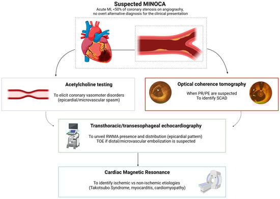 Diagnostic work-up of suspected MINOCA. The figure illustrates a comprehensive diagnostic work-up including both invasive (OCT and Ach provocative testing) and non-invasive (transthoracic and/or transesophageal echocardiography, cardiovascular magnetic resonance) tests aimed at identifying the specific etiology underlying MINOCA according to a precision medicine approach strategy. Abbreviations: MI: myocardial infarction; PE: plaque erosion; PR: plaque rupture; RWMA: regional wall motion abnormality; SCAD: spontaneous coronary artery dissection; TOE: transesophageal echocardiography. The figure has been created in Biorender. Montone, R.A. (2025) https://BioRender.com/.