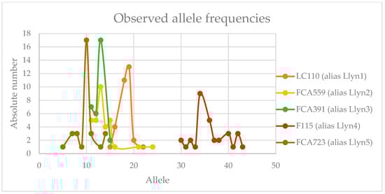 | Species | Sample | Amelogenin | Lc110 (Alias Llyn1) | FCA559 (Alias Llyn2) | FCA391 (Alias Llyn3) | F115 (Alias Llyn4) | FCA723 (Alias Llyn5) |