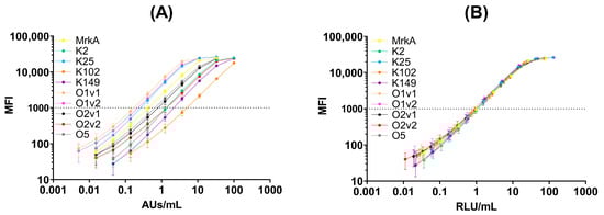 To ensure optimal coupling performance, we identified saturated conditions through the assessment of various antigen quantities: 1, 10, 60, and 100 µg/1.25 × 106 beads for polysaccharide antigens, and 1, 15, and 30 µg/1.25 × 106 beads for MrkA antigen. Additionally, in order to identify the minimum antigen amount necessary to maximize signal while minimizing background interference, hyperimmune serum was tested using secondary antibody at three different concentrations (from 5 to 10 µg/mL) and four different incubation times (from 15 min to 1 h).