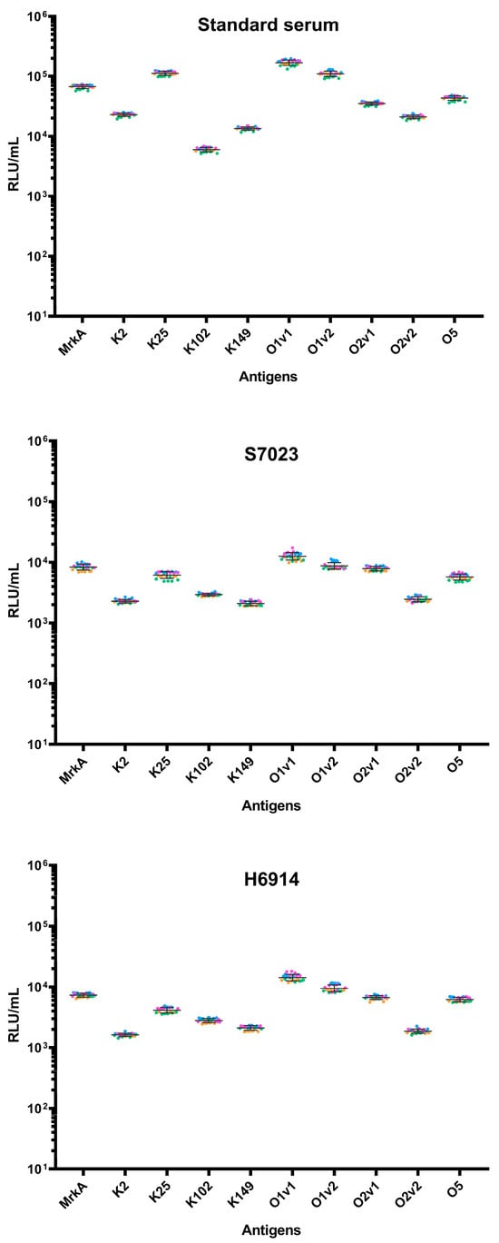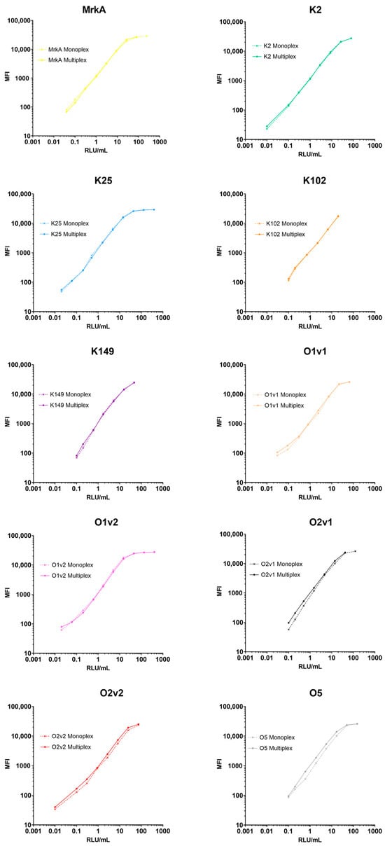 Different amounts of KAg (ranging from 1 to 100 µg/1.25 × 106 beads), OAg (ranging from 1 to 100 µg/1.25 × 106 beads), and MrkA (ranging from 1 to 30 µg/1.25 × 106 beads) were tested to identify the optimal bead coupling conditions. The anti-human IgG detection antibody was titrated as well in terms of dilution and incubation time. Conjugation concentrations of 1 µg/1.25 × 106 beads for KAg and OAg and 15 µg/1.25 × 106 beads for MrkA, with a phycoerythrin-labeled secondary antibody at concentration of 10 μg/mL, were chosen to have the maximal dynamic range for all antigens: maximal mean fluorescence intensities >20,000 with concentrated positive sera and low background (blank) MFIs (result of <150 MFI) with assay buffer alone.