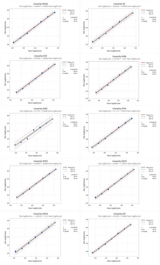Assay linearity regression analysis. Blue dots represent log(RLU/mL) obtained for specific diluted sera. Red line represents the linear regression trendline, and 95% CI and 95% PI are also reported.