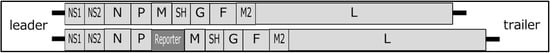 The schematic of RSV (top, about 15.2 kb) and reporter-expressing rRSV (bottom, about >16 kb) genome. Reporter genes such as GFP, mCherry and Luciferase proteins are inserted with gene start signal and gene end signal between RSV P and M genes.